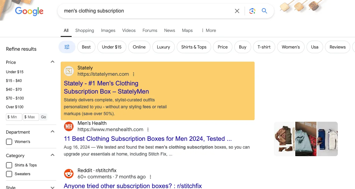 To address STATELY’s challenges, we initiated a comprehensive strategy that combined technical SEO improvements with targeted content marketing. We began by optimizing the website’s structure, ensuring faster load times and better user experience to improve search engine performance. Simultaneously, we developed and implemented a robust content strategy, focusing on high-value keywords related to men’s clothing and subscription services. By creating engaging, SEO-friendly content and aligning it with STATELY’s core business goals, we laid the foundation for sustainable organic growth and increased visibility in search engine results.