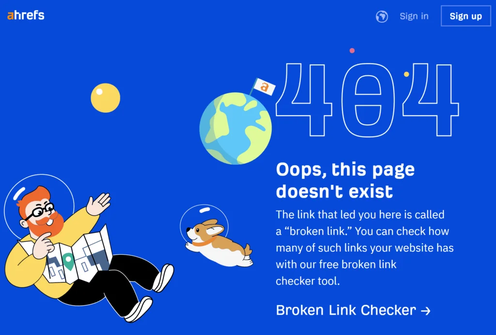 In this 404 example, I wish Ahrefs included their main navigation, but going with a call-to-action (CTA) to try their software that includes a clever inversion (what if your website has the same problem?) is pretty good.