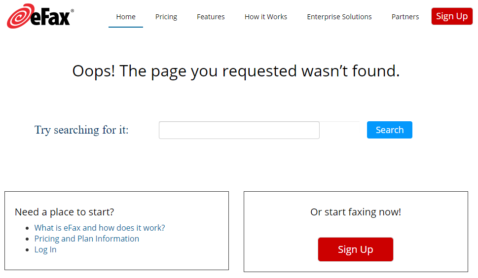 If users reach a dead end on a default error page, they will leave the website and search for something else. But with a custom 404 error page, you can give users a clear path to a new destination on your website, keeping them on your site. For instance, the eFax example from above presents users with internal site search and links to common pages that could put them back in the sales funnel.