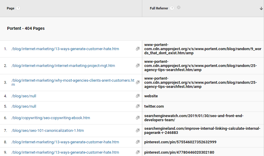 If we want to see which other domains are sending users to our 404 pages, we can add Full Referrer as a secondary dimension to the pageview report: