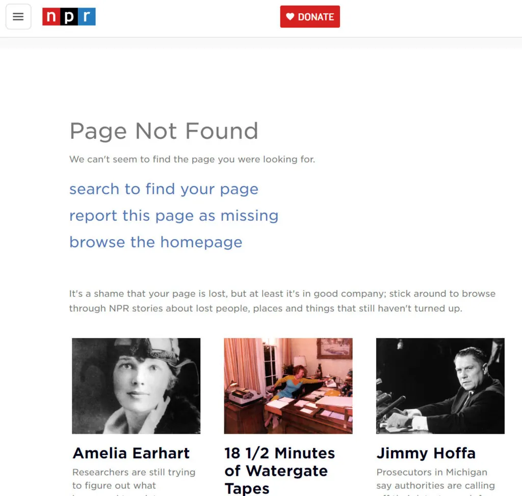 404 pages don’t have to be overly creative, especially if it isn’t part of the brand. NPR presents a very usable 404 page with a clever twist to get users back on track to reading their articles by linking content about lost people, places, and things.