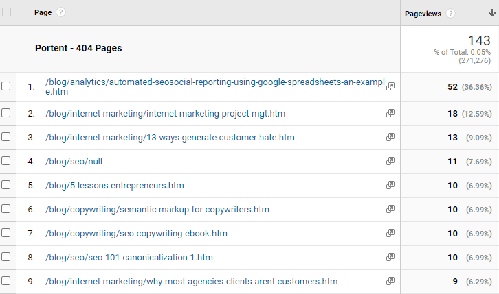 Here we see users are still navigating to some posts we removed in a content cleanup project. We’ll need to create redirects for these to solve the problem, but how is our 404 page performing after people see it?