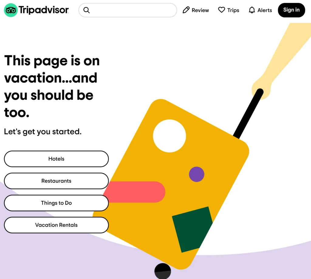 Tripadvisor’s 404 page is a great example of being creative while staying on task. They feature an animated suitcase to keep users engaged while they read the error message.
